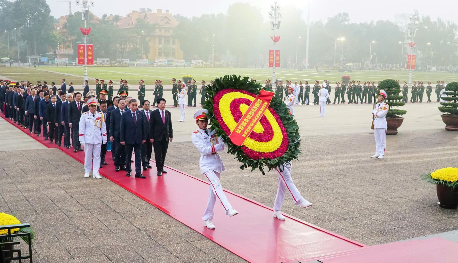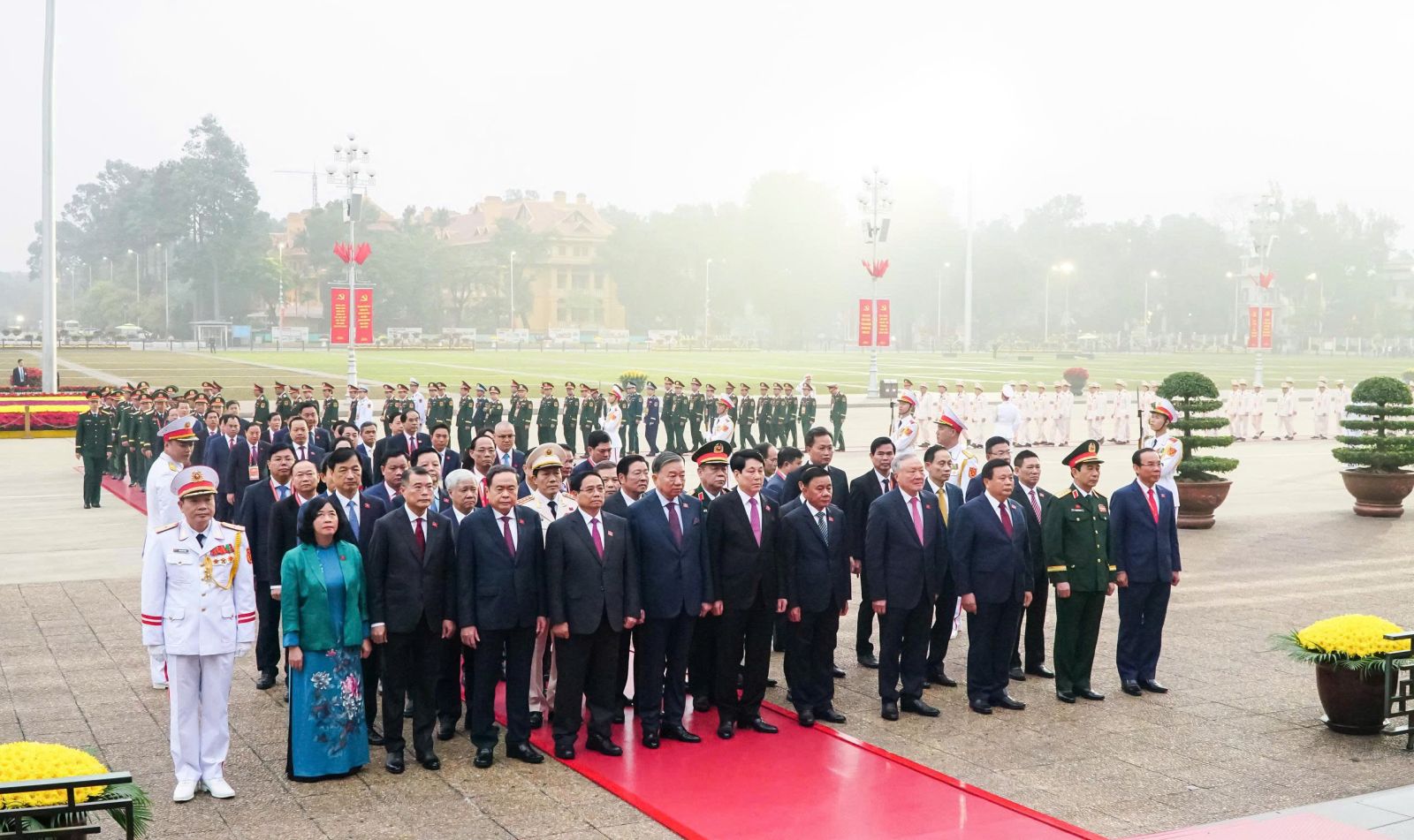 Tổng Bí thư Tô Lâm, Chủ tịch nước Lương Cường, Thủ tướng Chính phủ Phạm Minh Chính, Chủ tịch Quốc hội Trần Thanh Mẫn, Thường trực Ban Bí thư Trần Cẩm Tú cùng các đại biểu vào Lăng viếng Chủ tịch Hồ Chí Minh.