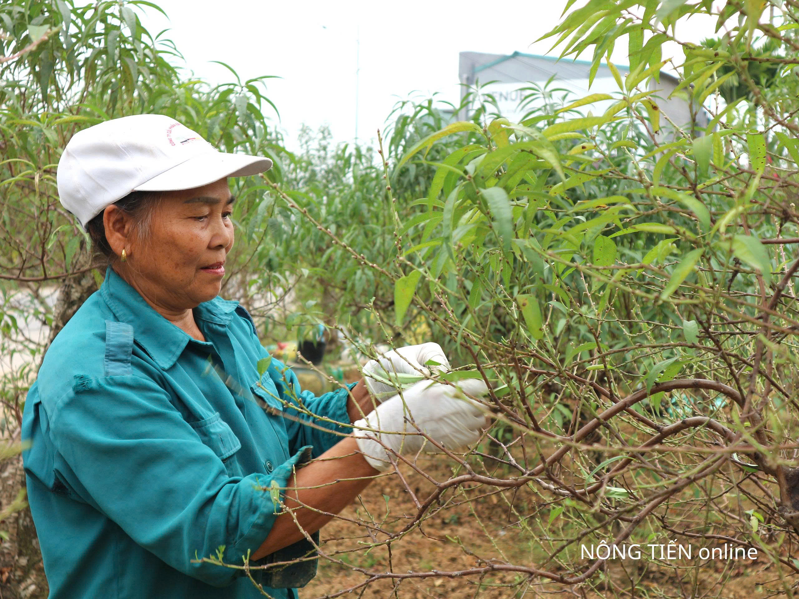 Theo bà Hợi, sau khi tuốt lá, các mắt đào sẽ bật chồi, hình thành nụ. Công việc tưởng chừng đơn giản nhưng đòi hỏi sự tỉ mỉ và kinh nghiệm; chỉ cần sơ suất nhỏ cũng có thể ảnh hưởng đến cả vụ hoa.