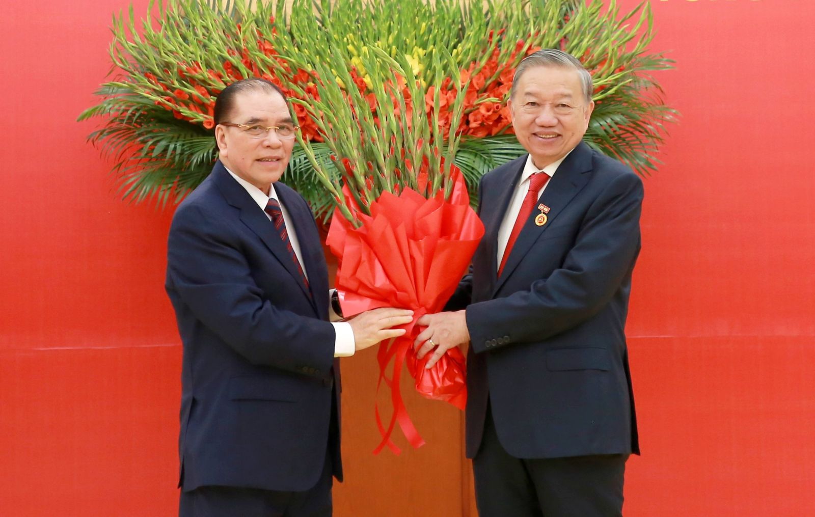 Đồng chí Trần Cẩm Tú, Uỷ viên Bộ Chính trị, Thường trực Ban Bí thư trao Huy hiệu Đảng và tặng hoa chúc mừng Tổng Bí thư Tô Lâm.