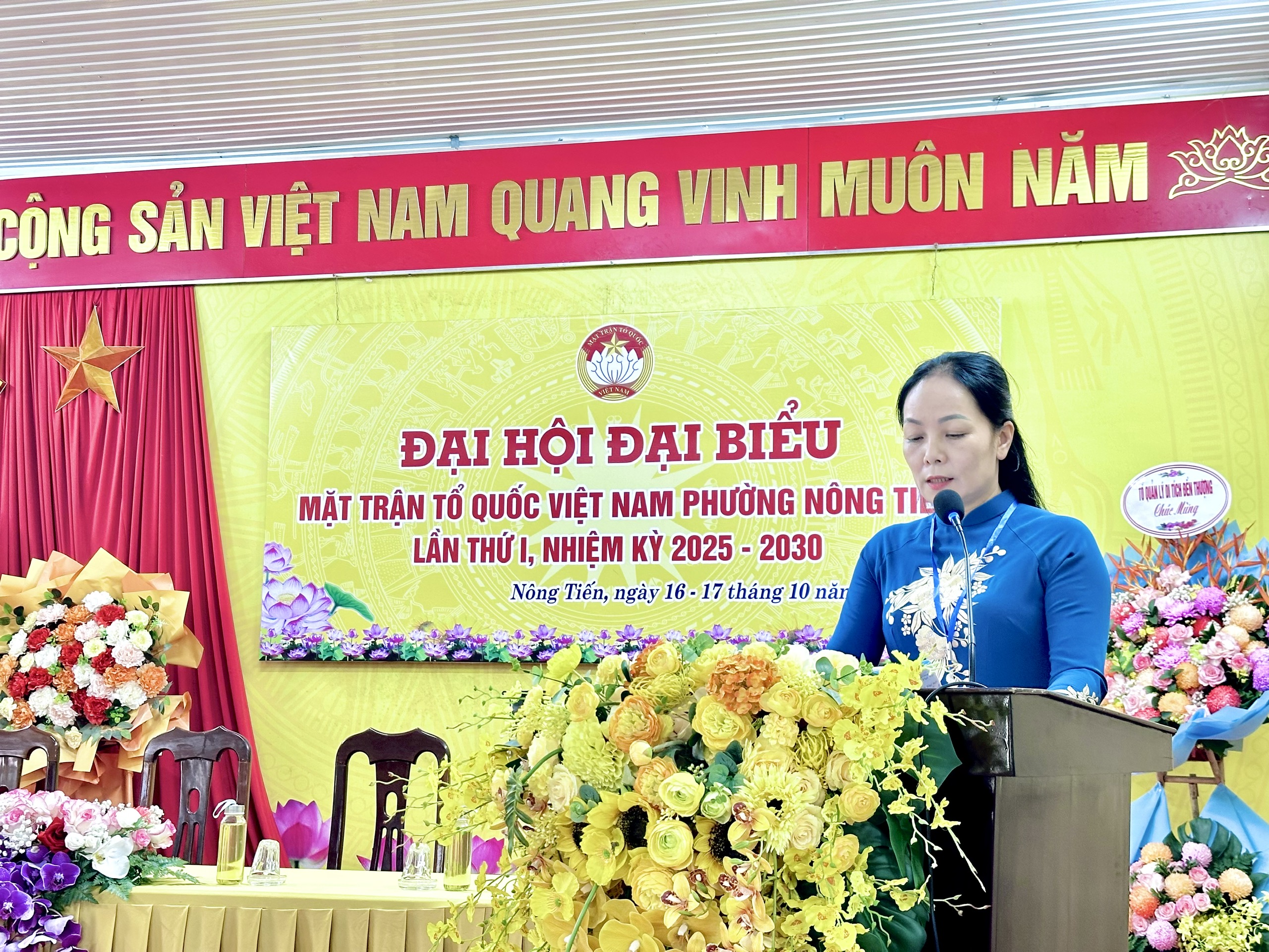 Tại Đại hội, các đại biểu đã hiệp thương bầu 61 vị vào Ủy ban MTTQ Việt Nam phường Nông Tiến khóa I, nhiệm kỳ 2025 – 2030. Ngay sau đó, Ủy ban MTTQ Việt Nam phường khóa I đã tiến hành phiên họp lần thứ nhất để bầu các chức danh lãnh đạo chủ chốt của Ủy ban, chuẩn bị nội dung cho phiên Đại hội thứ hai sẽ diễn ra trong sáng ngày 17/10/2025.